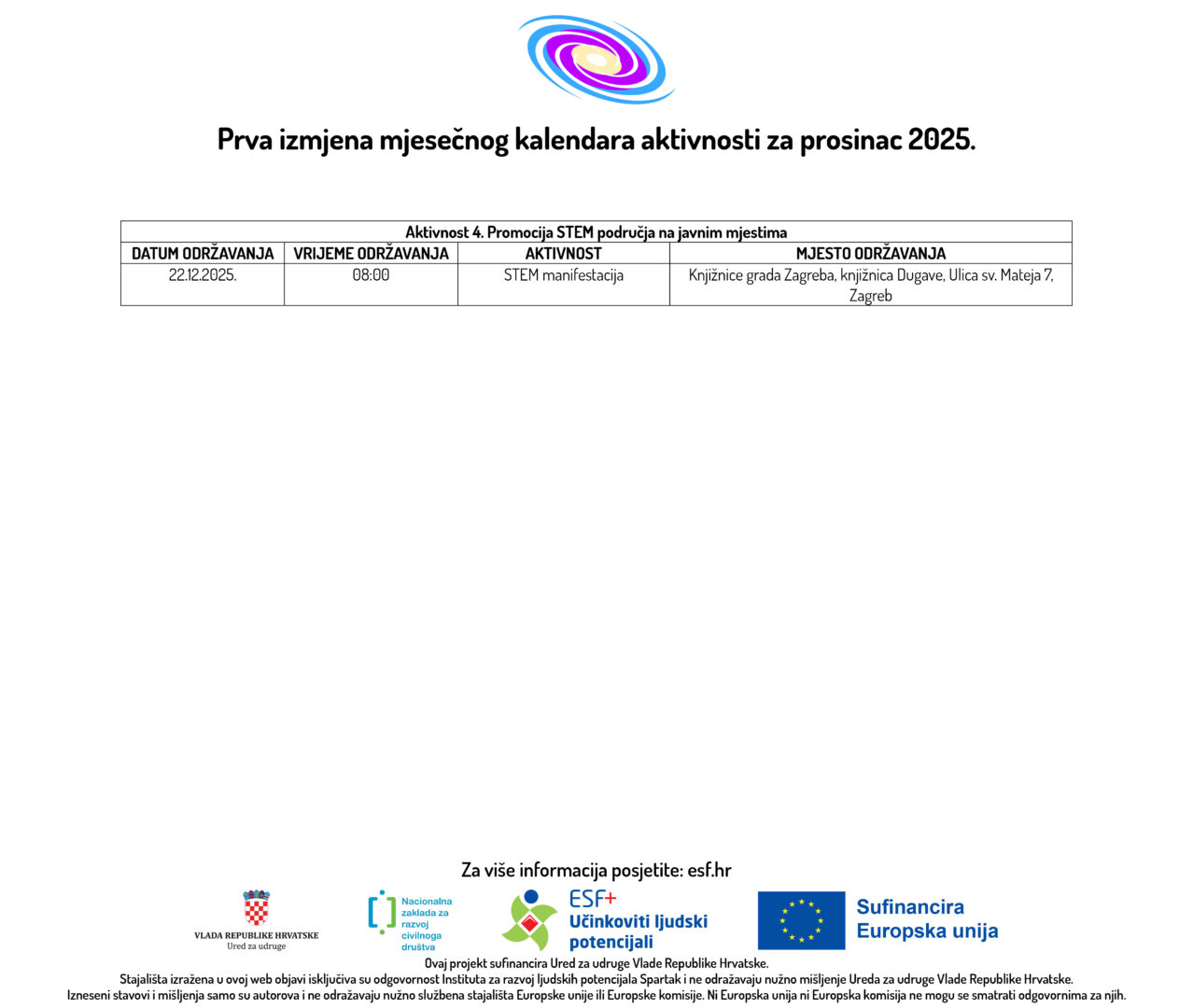 U prilogu možete pogledati Mjesečni kalendar aktivnosti za prosinac 2025. godine u sklopu ESF+ projekta „STEM Learning Network“ (SF.2.4.06.04.0081) ukupne vrijednosti od 297.557,55 eura, od