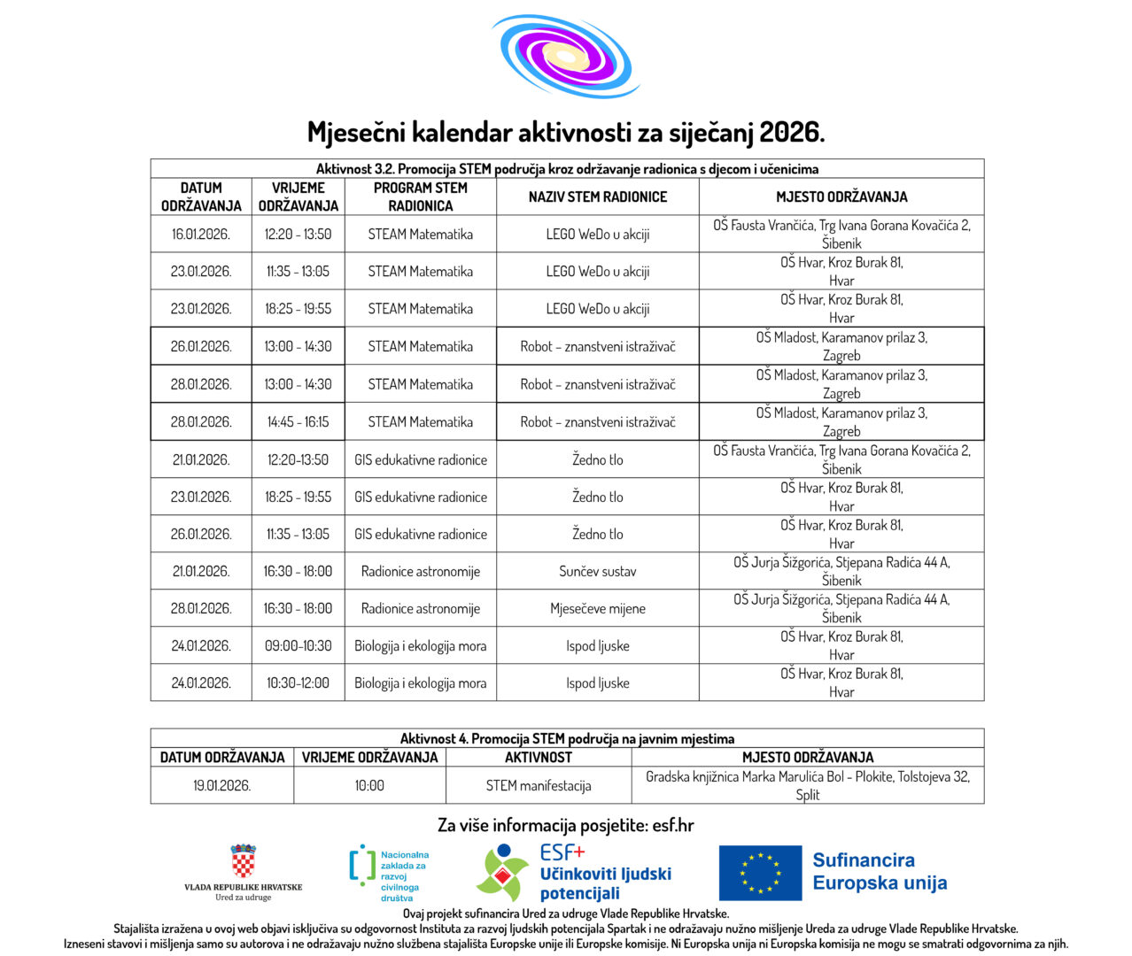 U prilogu možete pogledati Mjesečni kalendar aktivnosti za siječanj 2026. godine u sklopu ESF+ projekta „STEM Learning Network“ (SF.2.4.06.04.0081) ukupne vrijednosti od 297.557,55 eura, od