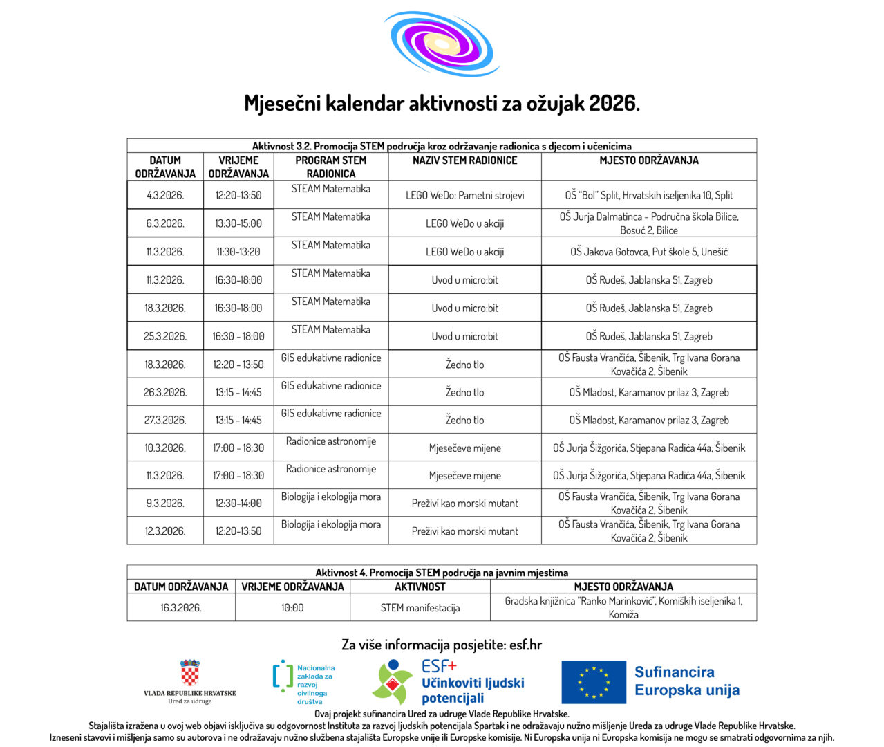 U prilogu možete pogledati Mjesečni kalendar aktivnosti za ožujak 2026. godine u sklopu ESF+ projekta „STEM Learning Network“ (SF.2.4.06.04.0081) ukupne vrijednosti od 297.557,55 eura, od čega bespovratna sredstva iznose 295.480,70 eura, a iznos EU sufinanciranja 251.158,59 eura. Provedba projekta će trajati u razdoblju od 20. ožujka 2025. do 20. ožujka 2027. godine. Prijavitelj je Institut za razvoj ljudskih potencijala Spartak. Partneri na projektu su: Krugovi, centar za edukaciju, savjetovanje i humanitarno djelovanje, Institut Ruđer Bošković, Sveučilište Algebra Bernays, Osnovna škola Hvar, Osnovna škola Pirovac, Osnovna škola Jakova Gotovca i Osnovna škola Mladost.