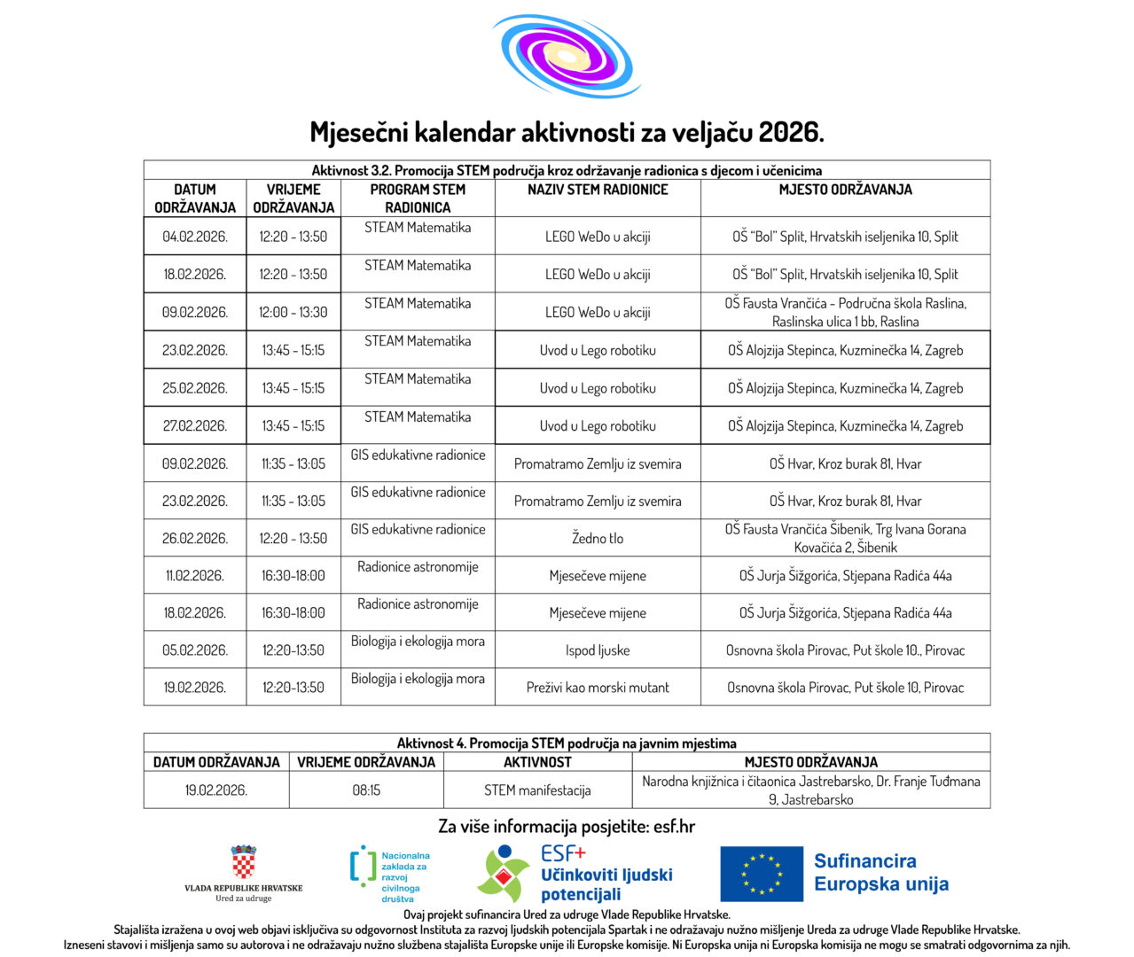 U prilogu možete pogledati Mjesečni kalendar aktivnosti za veljaču 2026. godine u sklopu ESF+ projekta „STEM Learning Network“ (SF.2.4.06.04.0081) ukupne vrijednosti od 297.557,55 eura, od čega bespovratna sredstva iznose 295.480,70 eura, a iznos EU sufinanciranja 251.158,59 eura. Provedba projekta će trajati u razdoblju od 20. ožujka 2025. do 20. ožujka 2027. godine. Prijavitelj je Institut za razvoj ljudskih potencijala Spartak. Partneri na projektu su: Krugovi, centar za edukaciju, savjetovanje i humanitarno djelovanje, Institut Ruđer Bošković, Sveučilište Algebra Bernays, Osnovna škola Hvar, Osnovna škola Pirovac, Osnovna škola Jakova Gotovca i Osnovna škola Mladost.