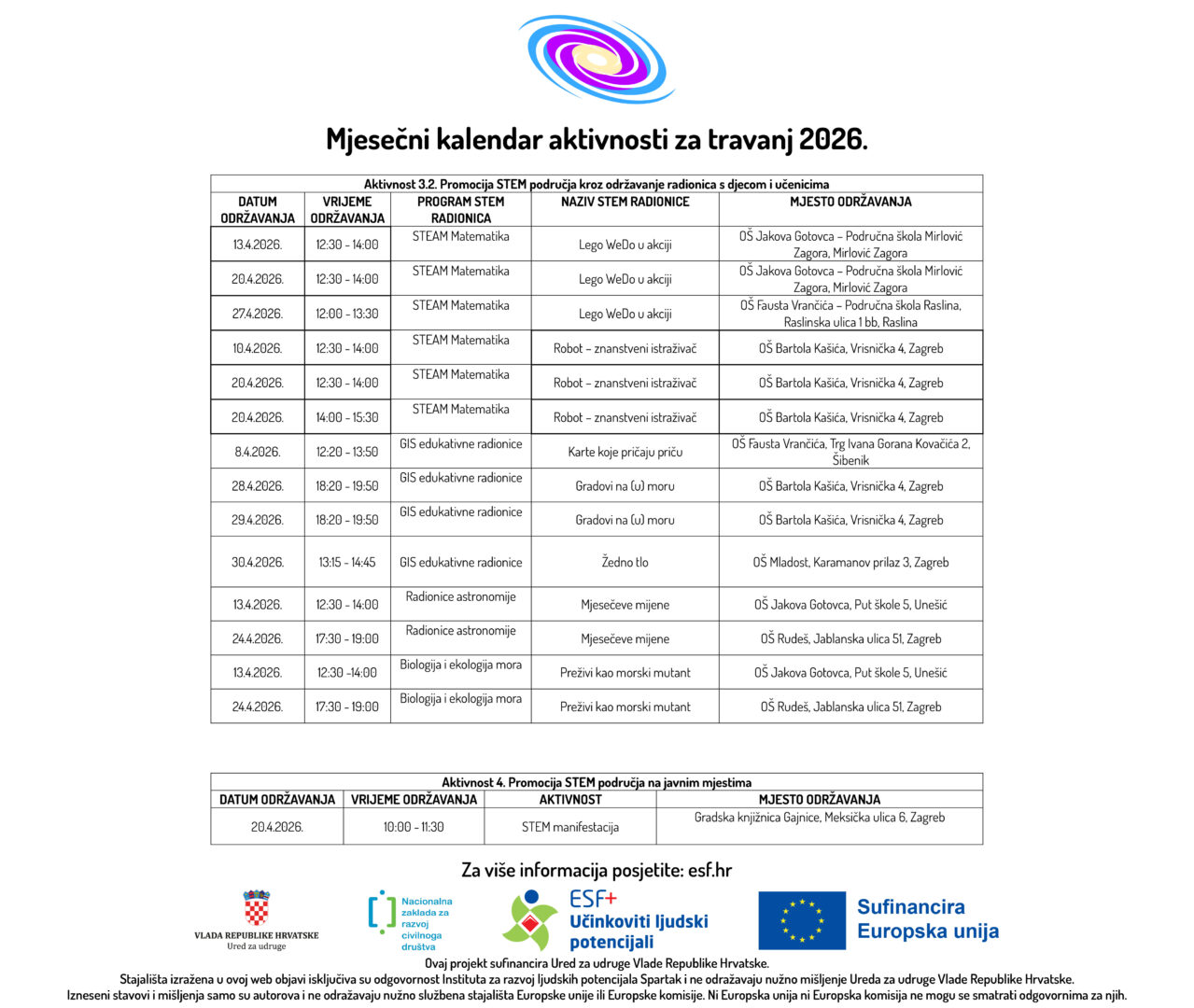 U prilogu možete pogledati Mjesečni kalendar aktivnosti za travanj 2026. godine u sklopu ESF+ projekta „STEM Learning Network“ (SF.2.4.06.04.0081) ukupne vrijednosti od 297.557,55 eura, od čega bespovratna sredstva iznose 295.480,70 eura, a iznos EU sufinanciranja 251.158,59 eura. Provedba projekta će trajati u razdoblju od 20. ožujka 2025. do 20. ožujka 2027. godine. Prijavitelj je Institut za razvoj ljudskih potencijala Spartak. Partneri na projektu su: Krugovi, centar za edukaciju, savjetovanje i humanitarno djelovanje, Institut Ruđer Bošković, Sveučilište Algebra Bernays, Osnovna škola Hvar, Osnovna škola Pirovac, Osnovna škola Jakova Gotovca i Osnovna škola Mladost.